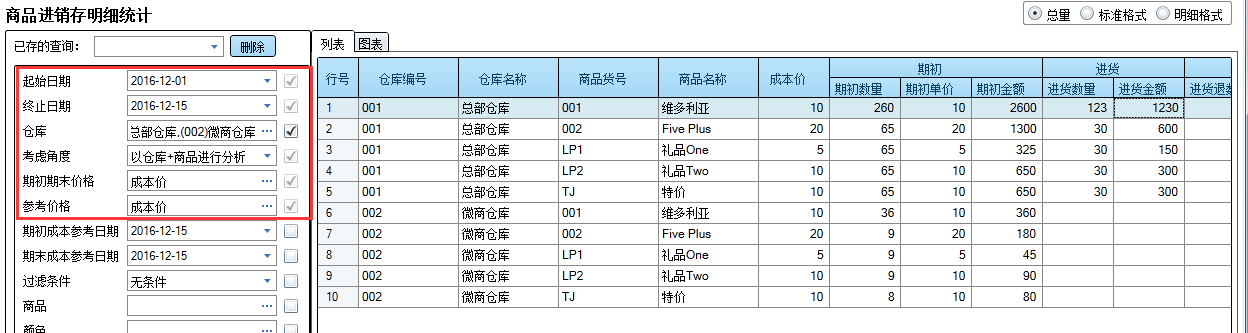通过“商品进销存明细统计”报表,可以查看该月的进货情况。查询条件,仓库要选择总部渠道的普通仓库和总部渠道的直营店店仓。