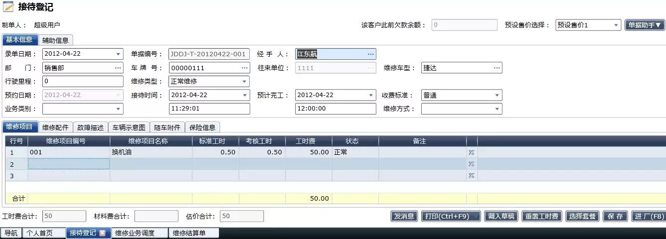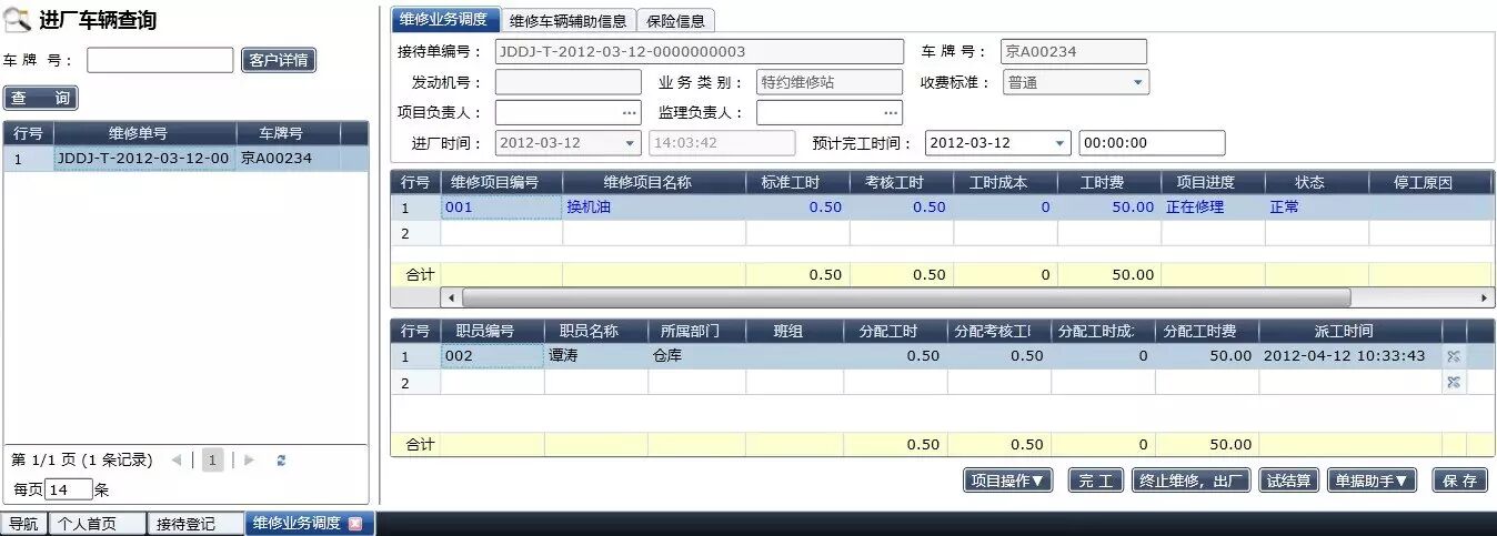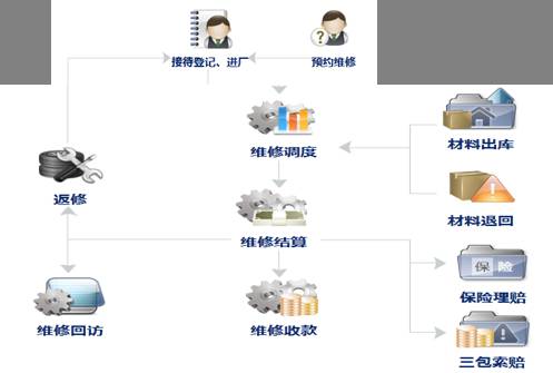 维修流程严谨规范,充分体现维修过程的每一个关键环节:预约登记->客户来店->维修估价->接待登记->车间调度->维修领料->项目调整->完工检查->结算付款->提车离店->维修回访->提醒关怀;